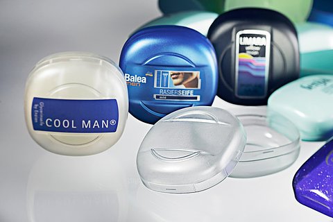 Kunststoffdose in verschiedenen Einfärbungen zur Aufbewahrung von Seifen